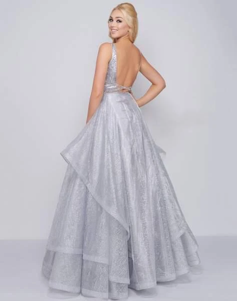 | Details: | Sleeveless, Sequined, Illusion Inset, Crisscrossing Belted Accent, Tiered Ruffles, Backless Design, Back Zipper Closure, Full Length Hem |