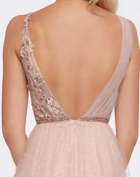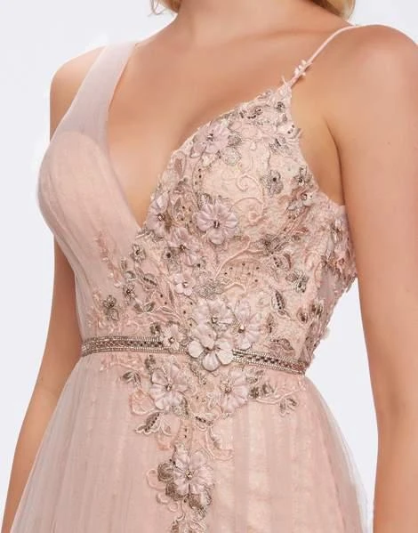 Exhibit your softer side in this delightful evening gown by Mac Duggal Prom 50546. This lovely masterpiece is fashioned in tulle over lace with a ruched bodice framed with a sweetheart neckline supported by sheer and spaghetti straps. Beaded floral appliques stretch along one side of the bodice toward the thigh-high slit. From the beaded waistband leads to the a-line skirt which ripples in pleats to full length finished with a sweep train. Go beyond beautiful in a precious gown from Mac Duggal creation.