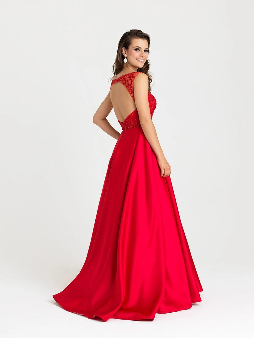 Smooth satin is topped with delicate beadwork in this sleeveless gown.