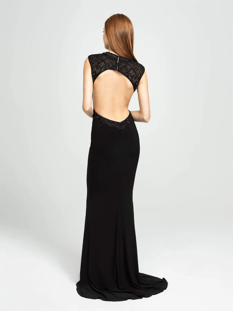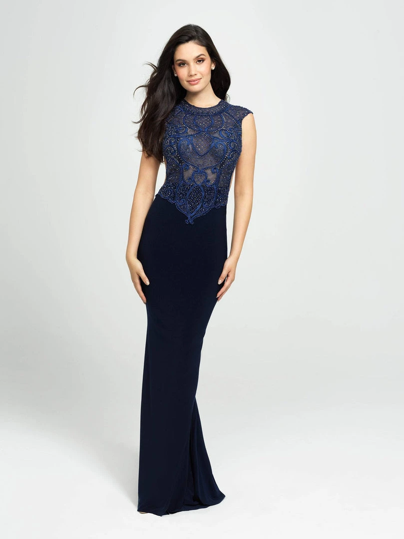 Be ready to have all eyes on you when you don this glamorous evening dress by Madison James 19-121. Striking bead embroideries beautify the sheer bodice framed with a jewel neckline and cap sleeves. The fitted sheath skirt tapers to full length finished with a sweep train for a perfect touch. The open cut detail at the back is certain to add allure to the whole ensemble. Make yourself into a vision of loveliness in this spectacular Madison James piece.
