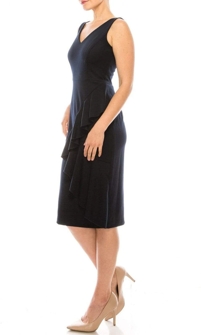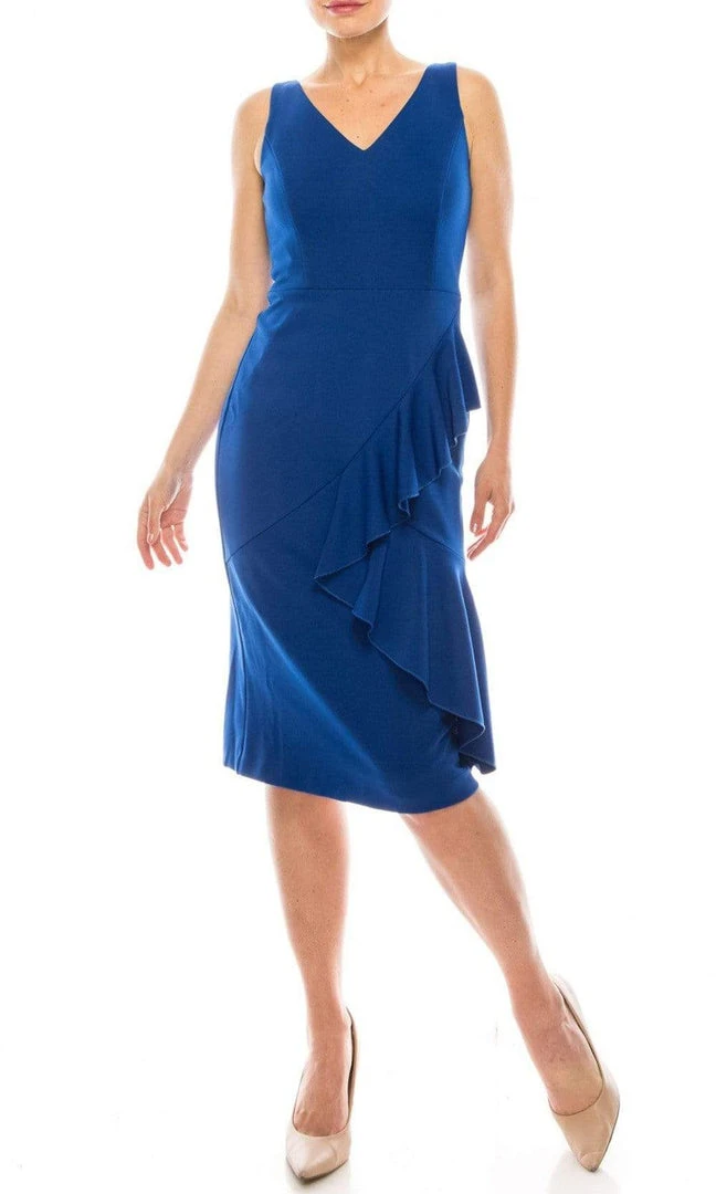 Show off your elegant style and soft curves in this pretty Maggy London G3907M dress. This bold toned scuba dress highlights a seam sculpted fitted sleeveless bodice with mirrored V neckline and back, featured with zig-zag ruffle accent along the skirt, finishing with a straight knee length straight hem. Bound to create admiring impression in this style by Maggy London.