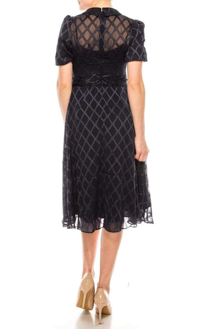 Craft a style that revels in the timeless chic design in this Maggy London G4451M creation. Overlaid and tailored with a textured chiffon fabric, this beauty is framed with short puff sleeves and a v-neckline with a collar. The sheer back has a zipper closure. Crowned with a tie ribbon accent along the waist, the skirt flares into a tea length hemline. Walk into the room with pure confidence in this Maggy London masterpiece.