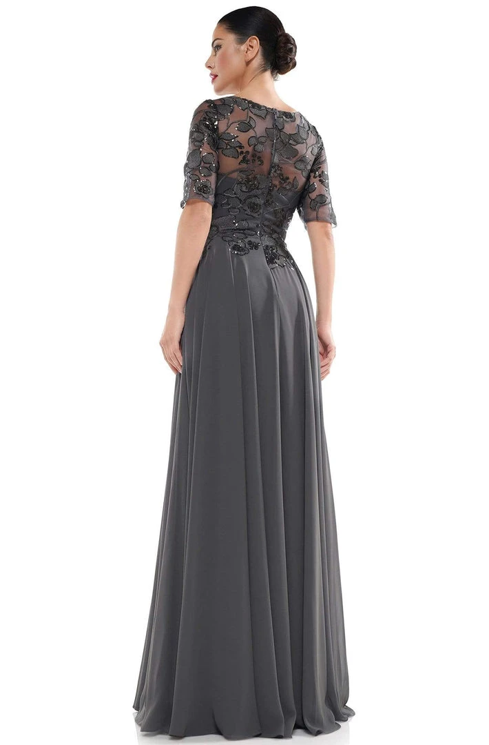 Get ready for everyone to stop and stare when you show up in this design by Marsoni by Colors M286. This sequined dress glams in a bateau neckline with quarter length sleeves. It has a sweetheart lined bodice with a zipper closure. The chiffon skirt flourishes a full length A-line silhouette. This Marsoni by Colors dress is sure to make you the darling of the party. Find more prom dresses!