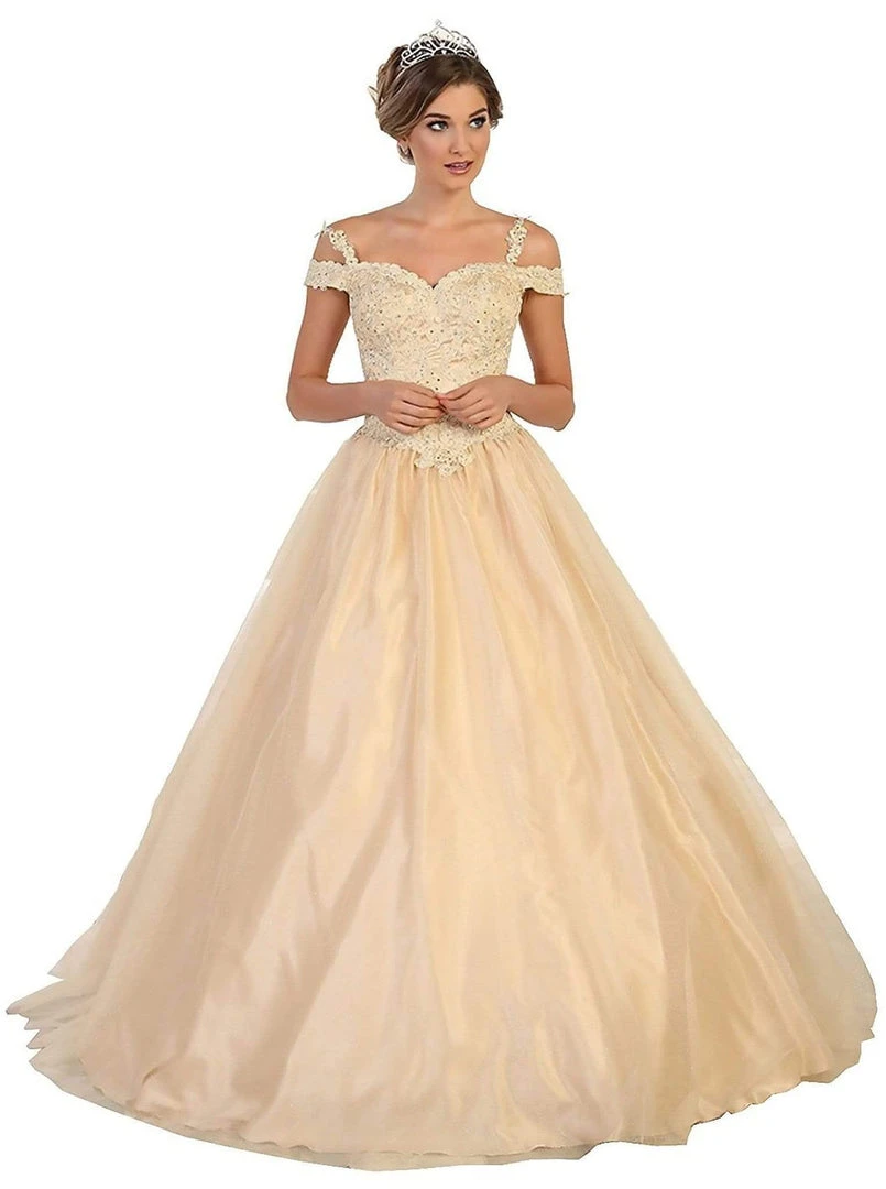 Dress to impress on your next formal event in this simple but captivating May Queen LK101 gown. Enchants in a sweetheart neckline with beaded lace bodice supported with spaghetti straps and off-shoulder sleeves. The back has lace up closure and completes the look in a ballgown silhouette, Be in this gorgeous May Queen creation and leave a lasting impression.