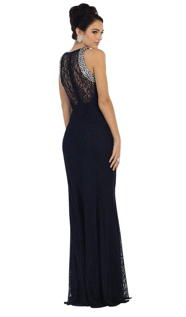 Go in the party and do that walk of a regal beauty in this fascinating May Queen MQ1475 creation. Overlaid with a stunning sheer lace fabric, this divine piece unveils bead and rhinestone embellishments?ÿtrimming the sleeveless bodice and lace material. The sheath skirt streams wondrously down to a full-length hemline and subtle train. This May Queen masterpiece will display your natural beauty and elegance.