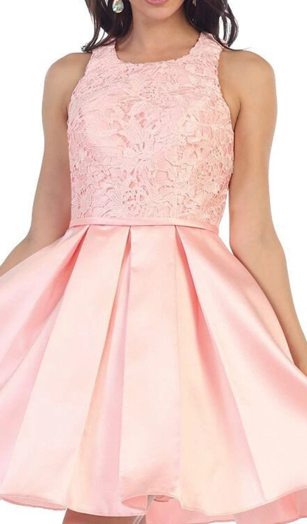 Get glamorous look with this dress by May Queen MQ1463. This fabulous short dress is a great pick for any occasion. This dress is made of lace and satin material and is emphasized with embroidered details. The sweet looking A-line skirt with pleated details is paired up perfectly with a simple, yet elegant looking jewel neckline. And all the way at the back is a zipper closure providing that clean finish. This May Queen creation is simply captivating!