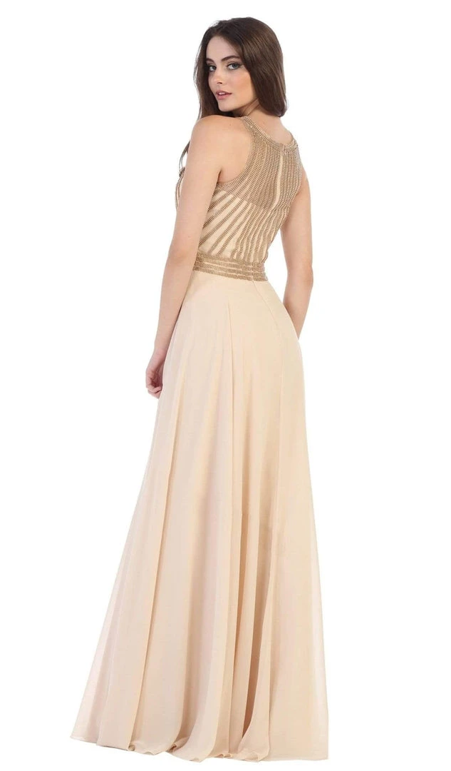 Look dreamy while gracefully twirling on the dancefloor in this chic May Queen MQ1586 creation. Adorned with metallic beaded stripes on a sleeveless bodice, this beauty shows an illusion jewel over a sweetheart neckline. Coupled with a sheer full back and a beaded stripe waistband, the chiffon skirt flutters fascinatingly to a full-length hem. Claim the spotlight with your charm in this May Queen masterpiece. Models are wearing the Black/Gold and Champagne colors.
