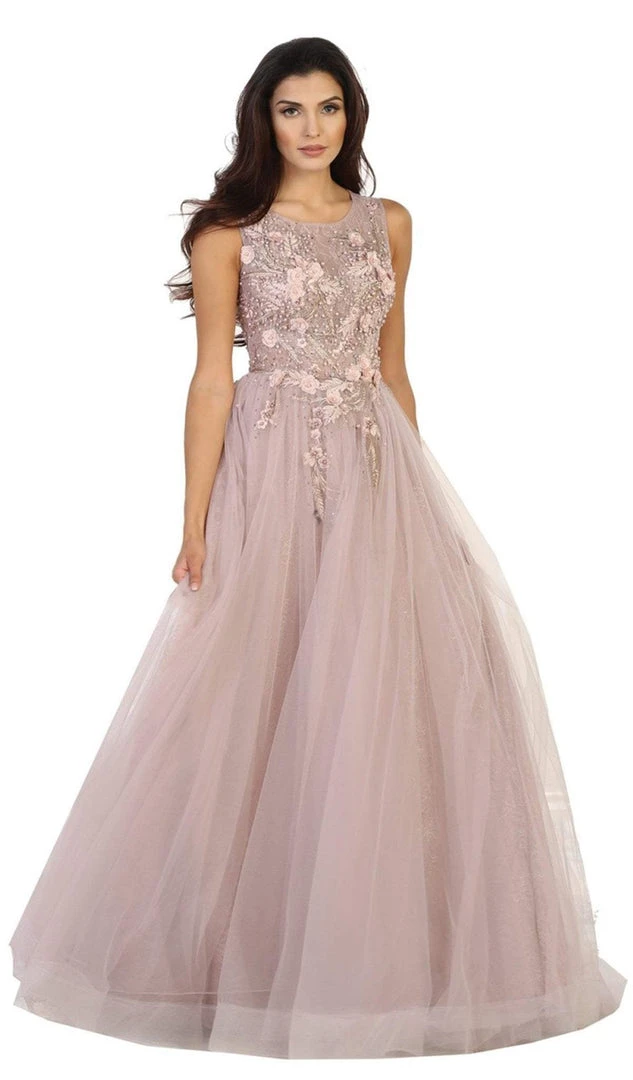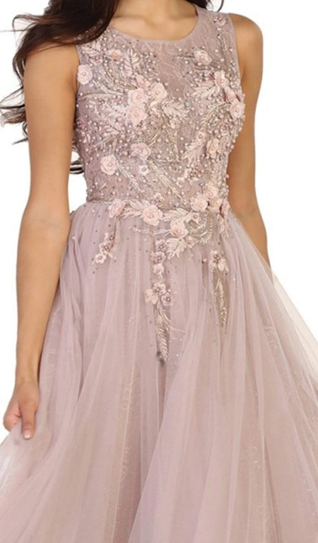 Get ready to wow the crowd wearing this evening gown by May Queen RQ7527. The dress showcases a sleeveless bodice with scoop neckline. The bodice is sheer with pearl and floral applique embellishment. The skirt is layered and flares to a ballgown silhouette with lovely sweep train. Wear this May Queen dress to prom, pageant, gala, or your next evening party!
