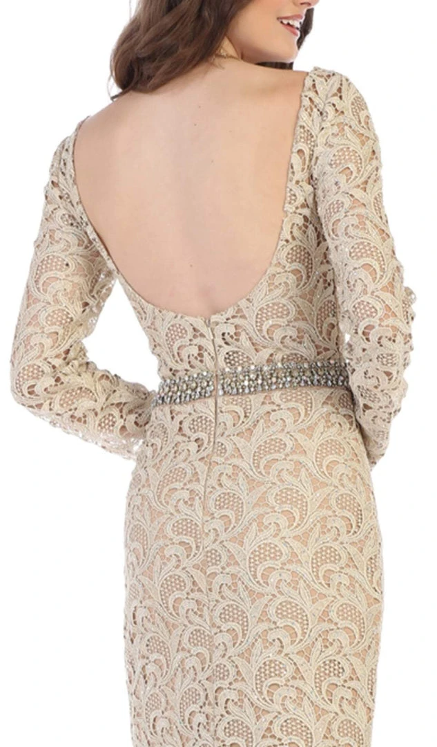 Channel your inner celebrity when you wear this masterpiece from May Queen RQ7671. Features an illusion/deep V-neckline with long sleeves. Made of lace fabric, the fitted bodice is wrapped in a crystal beaded belt and flaunts a low scoop back and a zipper closure. The skirt tapers at the thighs and flares at the bottom finishing in a sweep train. Dominate this luxurious event as you saunter into the ballroom with sass and allure in this chic May Queen dress.