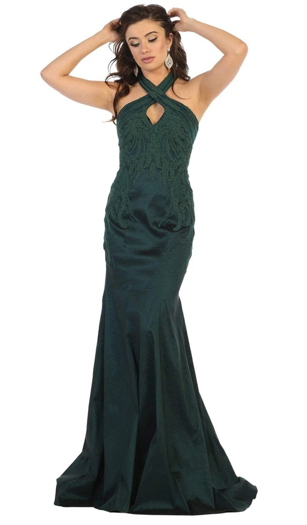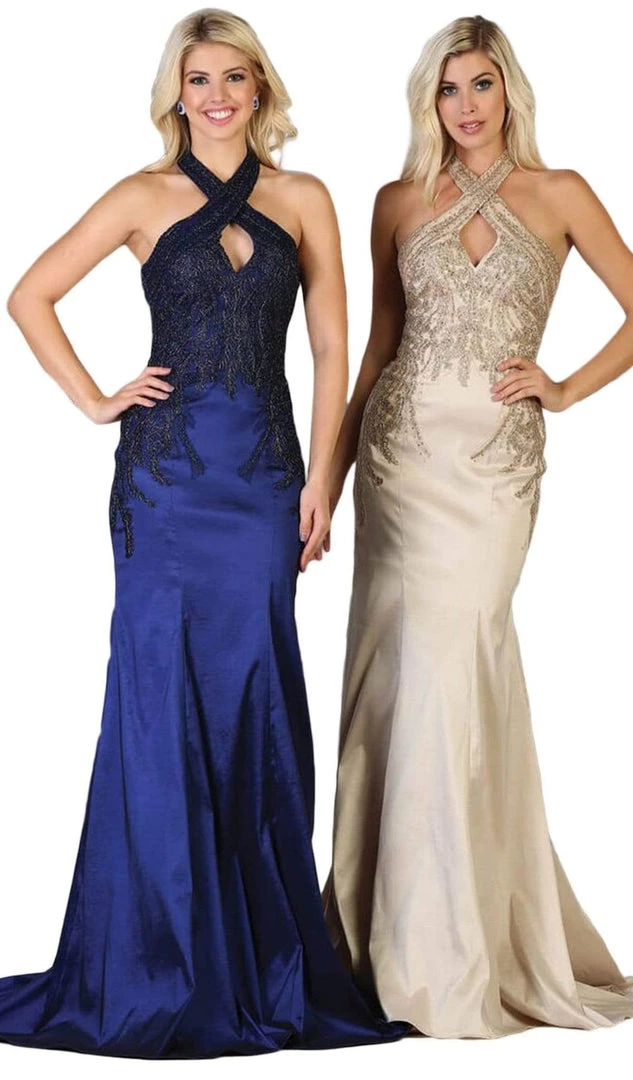 Be dressed up stunningly in this sophisticated evening dress by May Queen RQ7743. An inverted halter neckline crowns the fitted bodice adorned with striking appliques embellishments with a front cutout detail at the bust. Contoured with tailoring seams, the skirt flares elegantly to the floor highlighting a trumpet silhouette. This dress from May Queen is absolutely an awesome pick to your next social event.