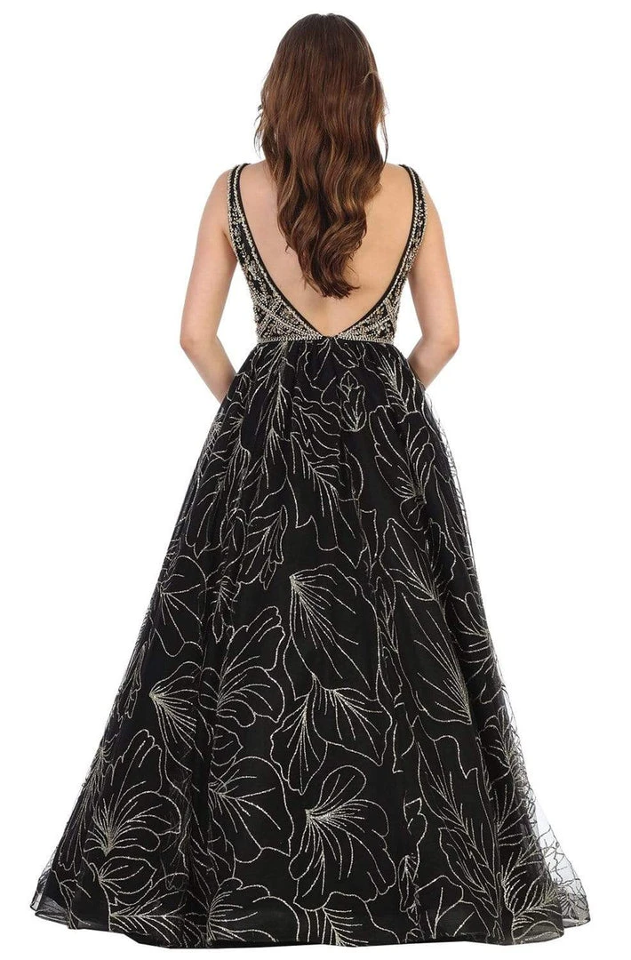 Create a dramatic entrance in this design by May Queen RQ7780. This bedazzled gown appeals a sleeveless, deep V-neckline with sheer panels on its fitted bodice. The skirt flourishes a ballgown silhouette and runs in full length hem. Mesmerize the crowd with your sophisticated flair in this May Queen masterpiece.