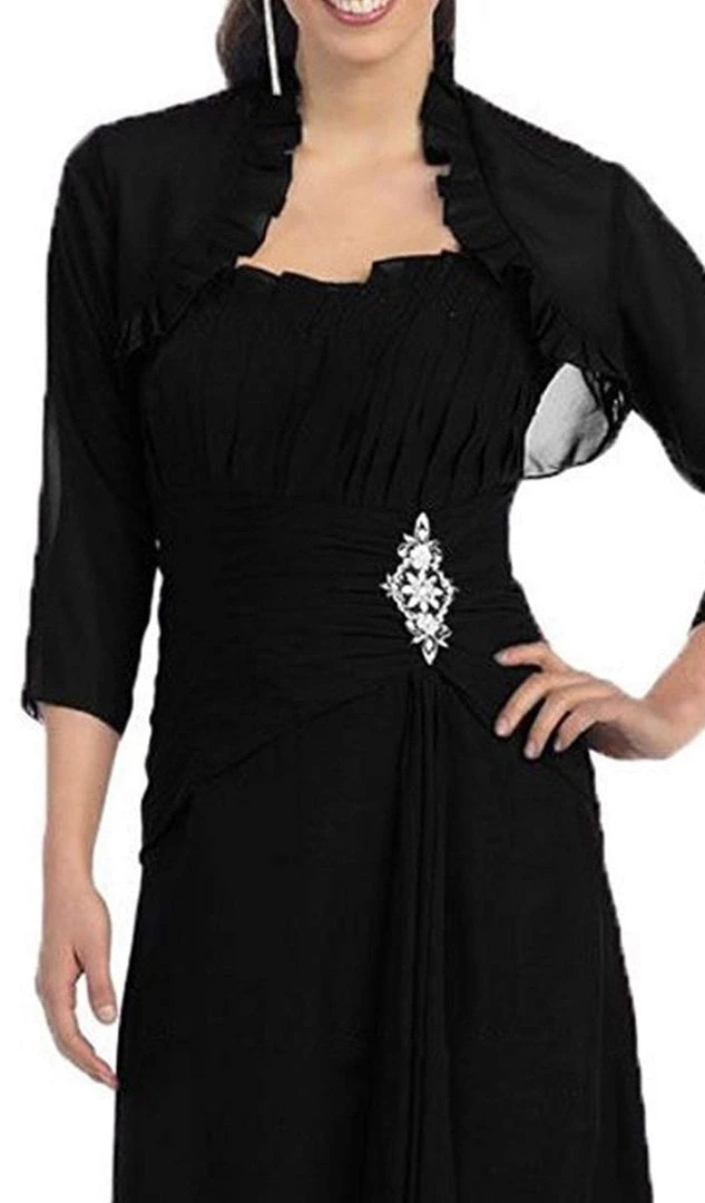 | Details: | Ruffled Quarter Sleeve Bolero, Pleated Bodice, Ruched Waistband, Brooch Accent, Mid-Open Back, Back Zipper Closure, Full Length Hem |