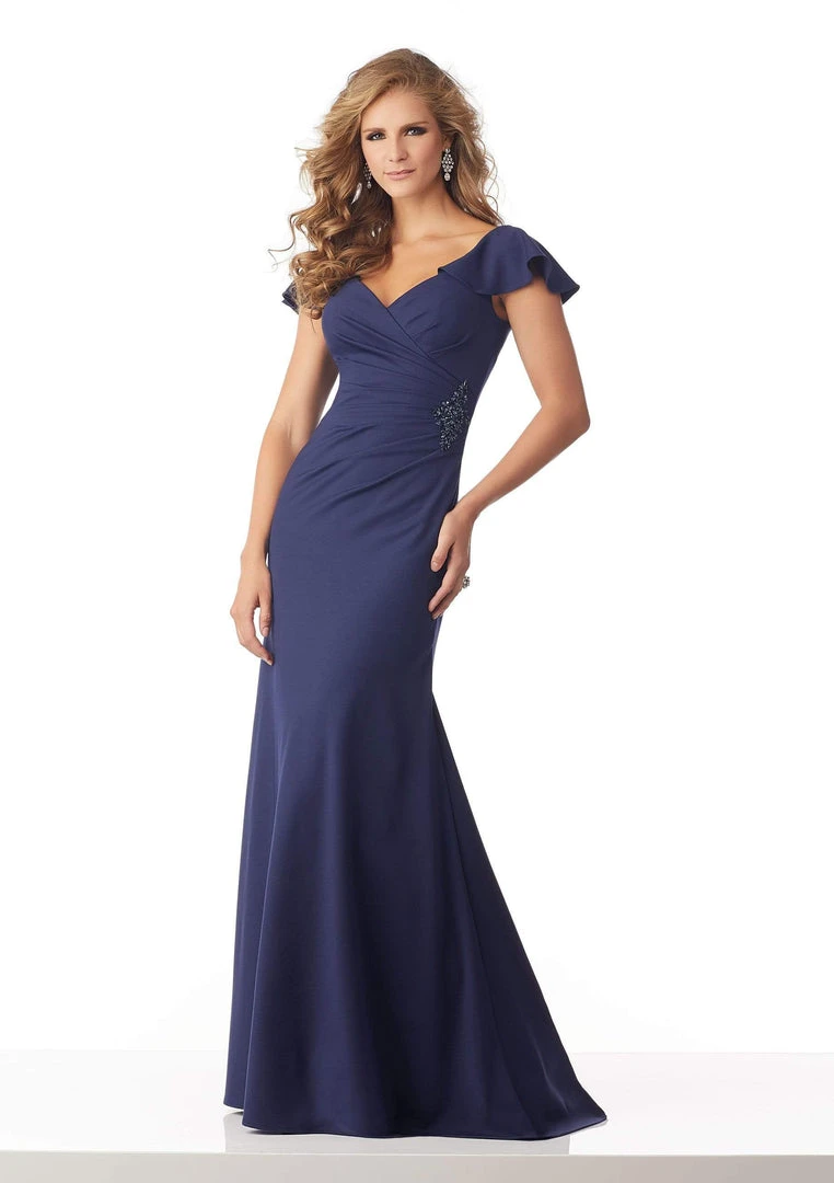 Look absolutely elegant with this stunning MGNY By Mori Lee 71831 evening dress. Ruching details accent the wrap style bodice and back, framed with a V neckline and flutter cap sleeves. Delicate beading adorns the side waist as it reveals a sheath skirt that cascades to the floor, finished with a sweep train. Be dressed up sophisticatedly with this MGNY By Mori Lee piece.