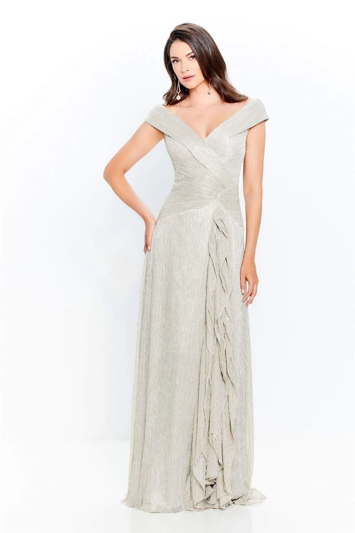 Get ready for everyone to stop and stare when you show up in this alluring Montage by Mon Cheri 219975W masterpiece. Tailored in novelty stretch fabric, this stunner features an asymmetrically ruched bodice and a dropped waistline, topped with an off-shoulder neckline. Side ruffles cascade the sheath skirt as it flows gorgeously to the floor, completed with a sweep train. Have all eyes on you when you show up wearing this Montage by Mon Cheri dress. Model is wearing Gunmetal color.