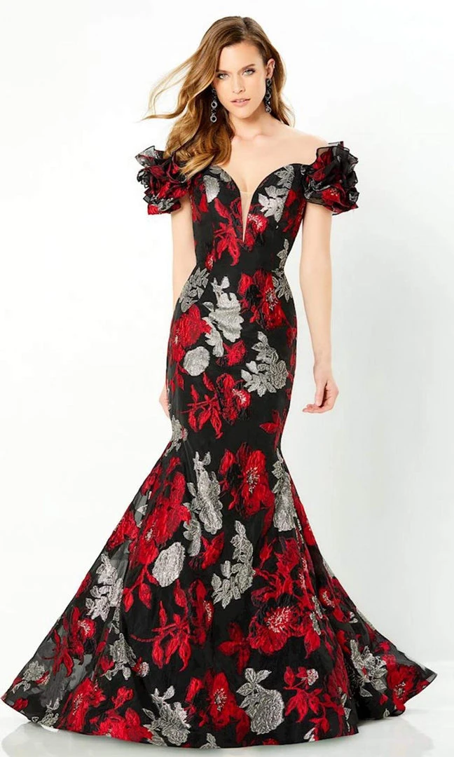 Be the spectacular belle on your next formal event in Montage by Mon Cheri 220952! This evening gown features a floral brocade, a trumpet silhouette, and a deep off-shoulder neckline with a sheer insert. Detachable sleeves comes with the dress, and finished with a sweep train. Create magical moments as you revel in Montage by Mon Cheri. Model is wearing Red/Silver/Black color.