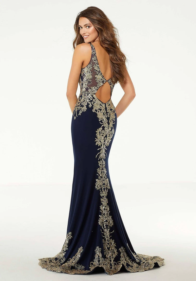 Make an extraordinary statement when you walk in this stunning Mori Lee 45024 evening gown. This dress is styled in sequins and glitter embroidery on net and a form-fitting jersey skirt. A plunging V neckline with sheer inset detail at the bust bisects the sleeveless bodice as the back reveals a V cut and keyhole detail. The skirt parades a sheath silhouette and sweeps gorgeously to the floor, completed with a sweep train. Put your best foot forward in this glamorous Mori Lee ensemble.