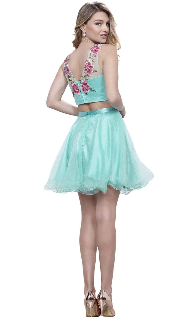 Look vibrant and youthful in this exquisite Nox Anabel 6228 ensemble. This short two-piece dress features an illusion sweetheart neckline with crop top styled with floral embroidery that splays to the back cut out. The dress has a zipper closure and is made of tulle fabric. The waist is cinched in a band and the multi-layered skirt finishes in a ruffled hemline. Celebrate their idyllic night in style while wearing this Nox Anabel ensemble.