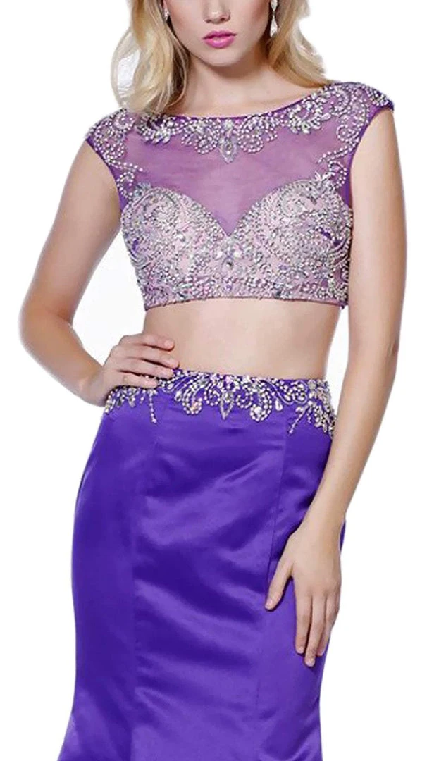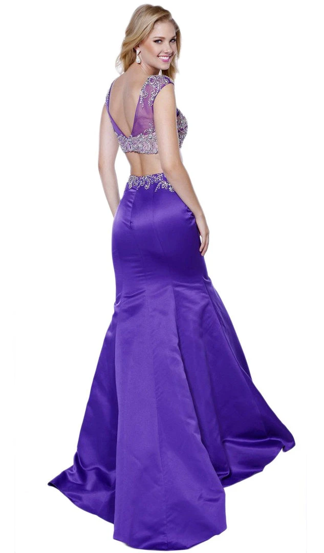 Look brilliantly stunning for your next special occasion in this glittering Nox Anabel 8176 long dress. This two piece ensemble showcases an illusion bateau neckline over a framed sweetheart lining and cap sleeves. The bodice and upper skirt is stunningly designed with crystals and rhinestones. This floor length skirt showcases a trumpet silhouette. The back has a vivid v shape and is enclosed with a center zipper. Look chic at the same time elegantly classy in this marvelous Nox Anabel design.