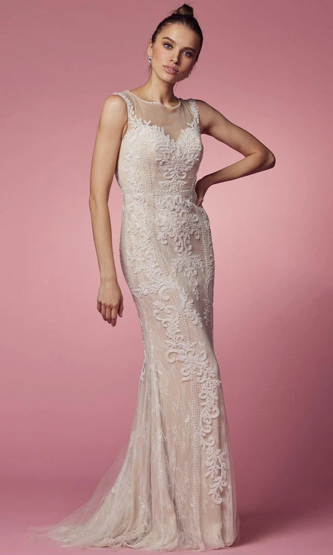 Flourish impeccable class in this gorgeous Nox Anabel E1006 creation. Rendered with a spectacle of intricate beaded lace appliques, this piece features an illusion jewel neckline over a sweetheart neckline. Styled with a sheer back and a zipper closure, the stunningly styled sheath skirt cascades into a sweep train. Inspire awe in this beautifully crafted Nox Anabel masterpiece. This stunning collection of Nox Anabel dresses will reflect your personality and give you an elegant red-carpet look. Models are wearing the Navy Blue and Nude colors.