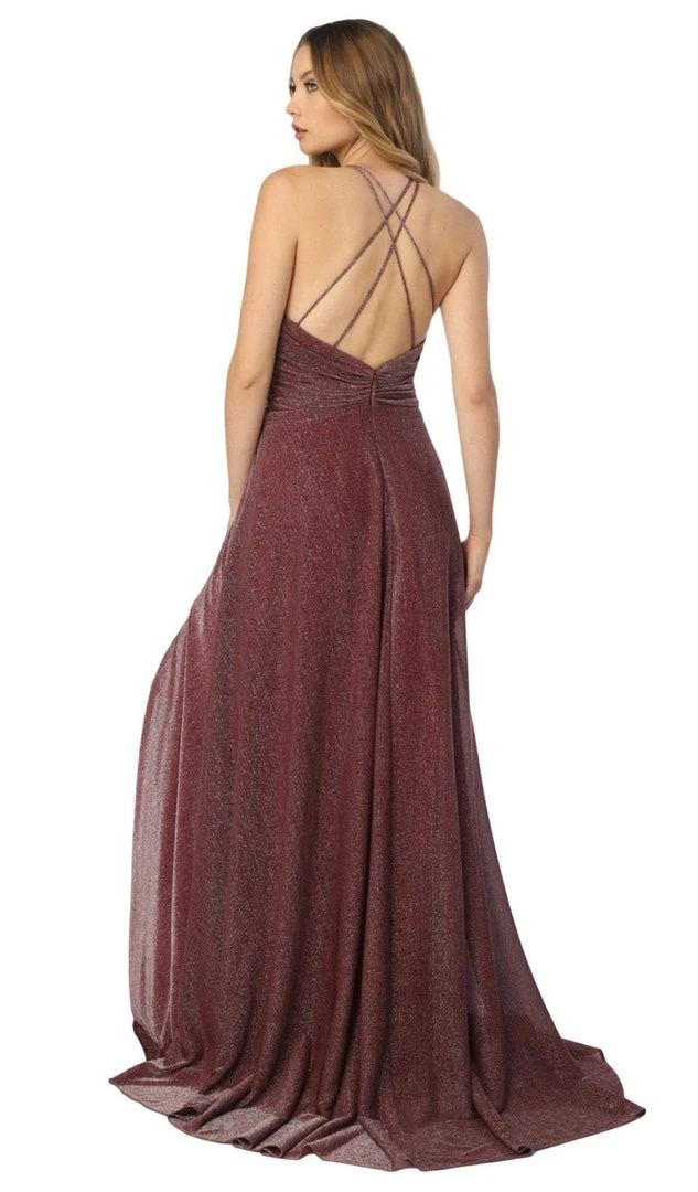 | Details: | Metallic, Cut-In Bodice, Sleeveless, Fine Ruching, Shirred Crisscross Bands, Double Crisscrossing Straps, Back Zipper Closure, High Slit, Sweep Train |