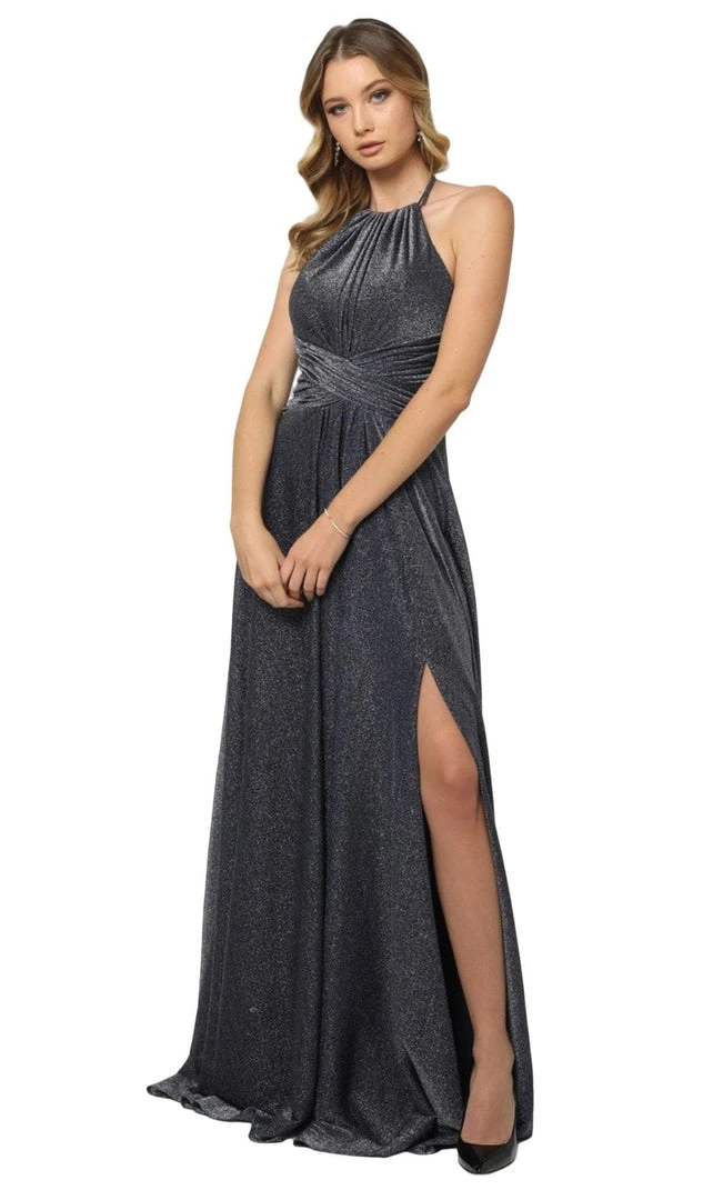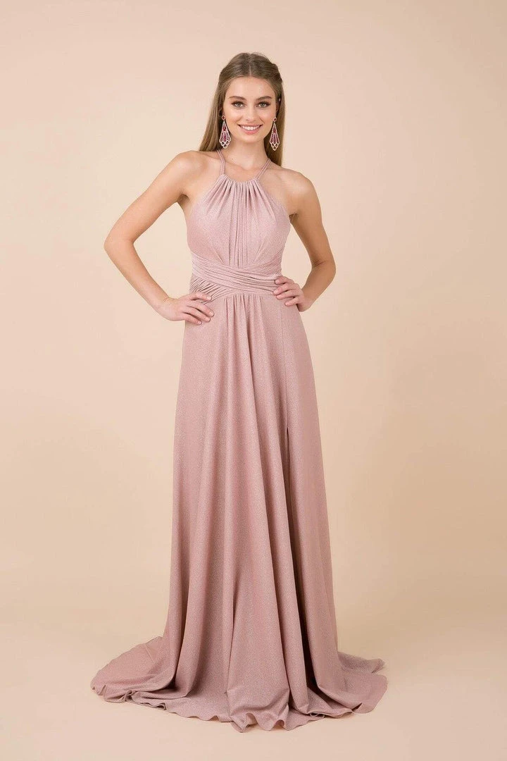 Glow with a magnificence that surpasses everyone in this Nox Anabel E184 creation. Craftily accented with fine ruching along the cut-in bodice, this dazzler flourishes a high halter neckline. Showcasing crisscross waistbands with fine shirring, the v-notched back presents double crisscrossing straps. The A-line skirt splits with a high slit as it ripples elegantly to the floor with a sweep of train. Look like a million bucks when you glide into that opulent event in this Nox Anabel masterpiece.Â