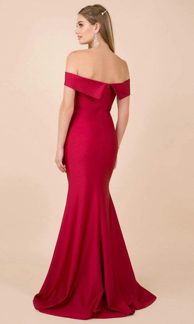 Flaunt your best assets in this figure-flattering evening dress by Nox Anabel N295. An off-shoulder neckline with folded detail crowns the fitted bodice, complemented with a mid-open back. Contoured with princess seams, this dress hugs your fabulous curves up to the hips as the skirt flares elegantly to the floor, highlighting a trumpet silhouette. This dress is completed with a sweep train for a dramatic effect. Beam with pride when you wear this stunning Nox Anabel creation. Model is wearing Dark Red color.