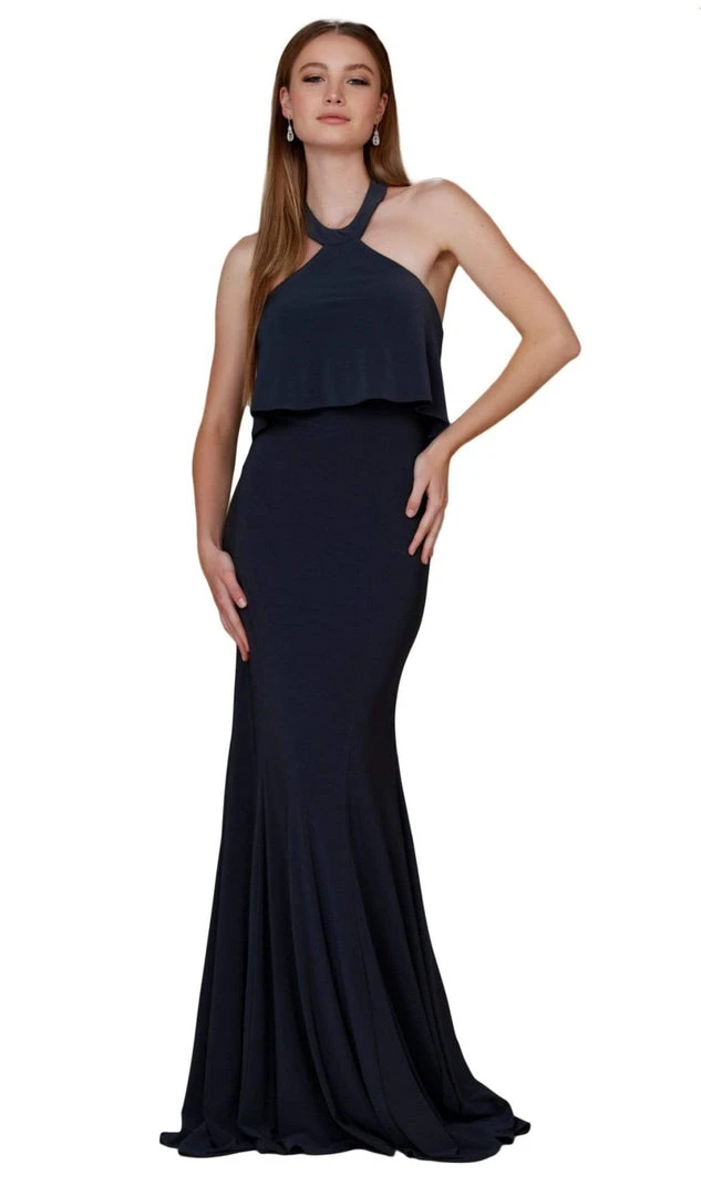 Get a timeless and trendy look in a new dress from Nox Anabel Q132. Glams in a sleeveless, halter neckline with a wave overlay at the front. The dress flaunts an open back detail and accents the trumpet skirt with a ruffle detail. Bringing drama to the look is a sweep train finish. Claim that look of sophistication wearing this glamorous look by Nox Anabel.