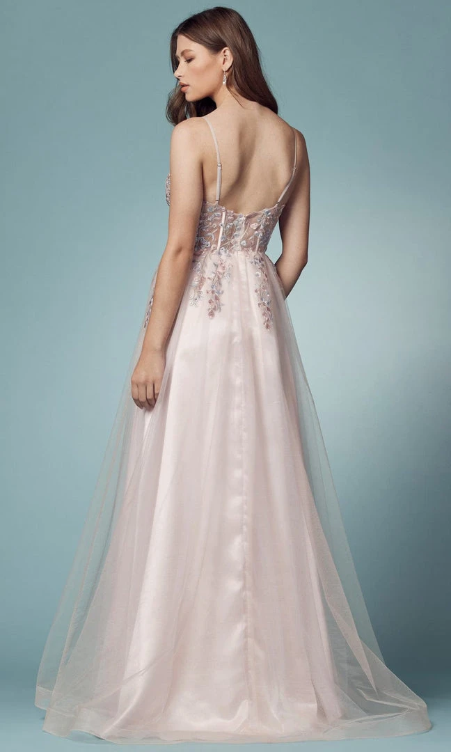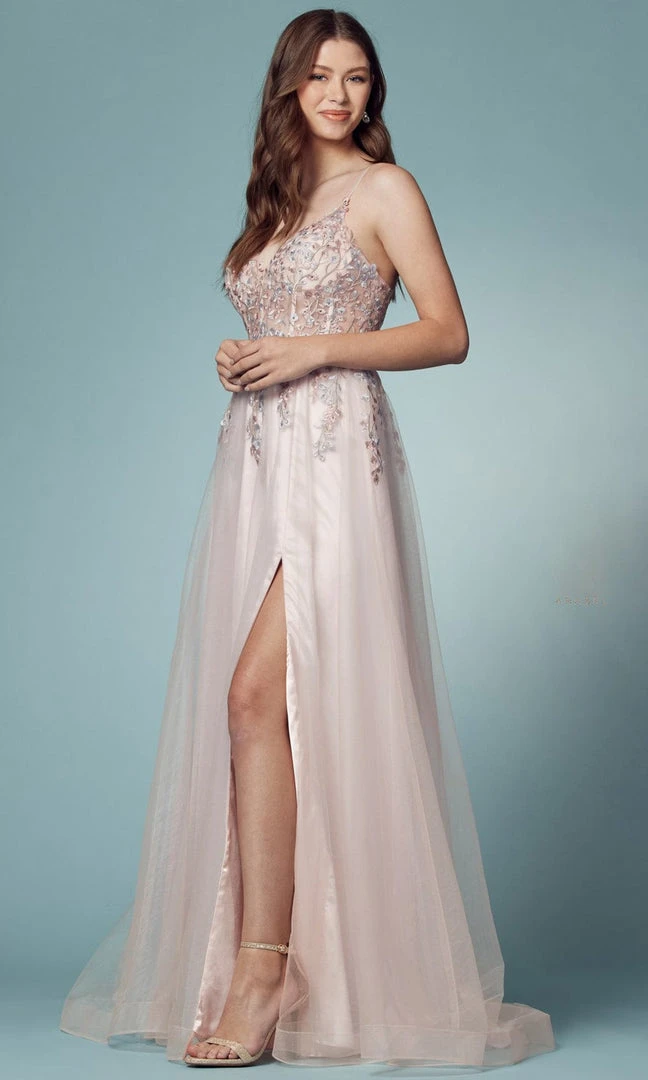 Be the spectacular belle on your next formal event in Nox Anabel S1015 evening gown. Ornamented with sprinkled of beads and floral lace embroidery, this gown reveals a sheer corset bodice, low V neckline and open back supported with adjustable spaghetti straps. The skirt opens with a front side slit as it flows into full length A-line silhouette. This Nox Anabel masterpiece is sure to make you the darling of the party! This stunning collection of Nox Anabel dresses will reflect your personality and give you an elegant red-carpet look. Model is wearing Blush color.