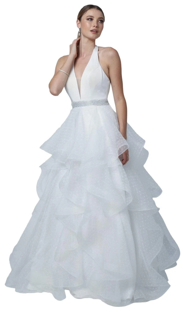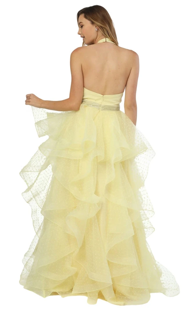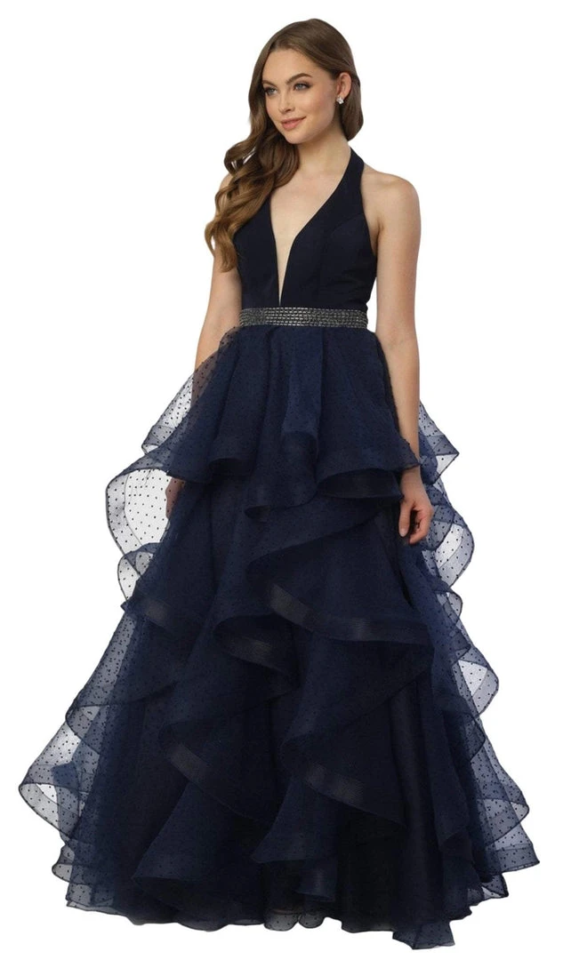 Unveil the style goddess in you in this elegantly fabricated Nox Anabel T256 creation. Contoured with seams along the sleeveless bodice, this stunner flourishes a plunging halter neckline with an illusion modesty inset. Defined with a mid-open back and embraced with a silver beaded waist design, this lavish ensemble flares in tiers of dotted lace cascading flatteringly down to touch the floor with a subtle train. Inspire people to give you an appreciative once over in this chic Nox Anabel masterpiece.