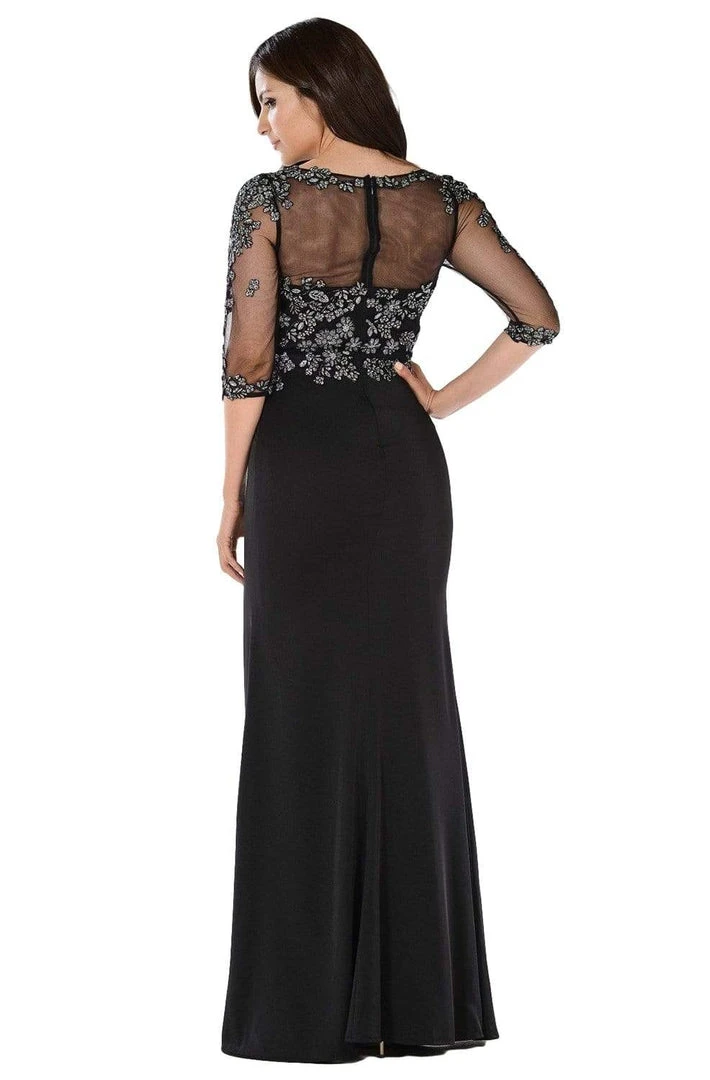 | Details: | Quarter Sleeves, Span Satin, Mesh, Rhinestones, Floral Embroidered, Illusion Back, Back Zipper Closure, High Slit, Sweep Train |