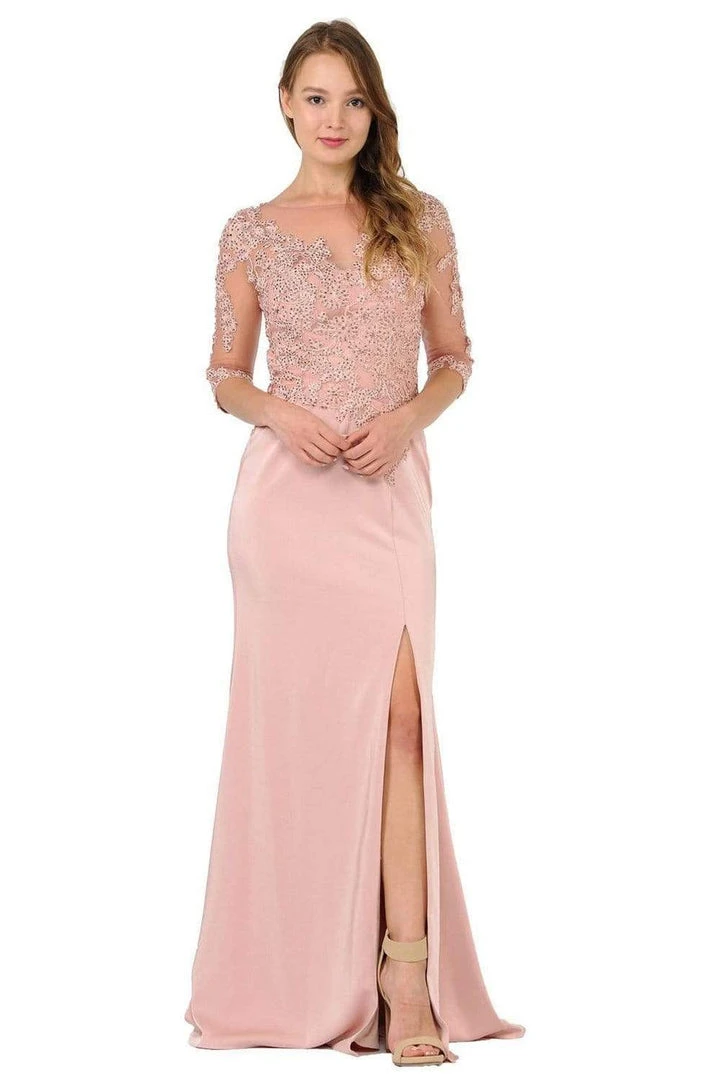 Make your fondest dream in this stunning Poly USA 7584 creation. Adorned with floral embroidery and rhinestones, this dress boasts of an illusion bateau neckline with sheer quarter sleeves. Ornamented with an illusion back, trailing blossoms accents the waist as the trumpet opens with a sexy slit and falls into a sweep of train. Charm everyone with the sheer magnificence of this Poly USA masterpiece.