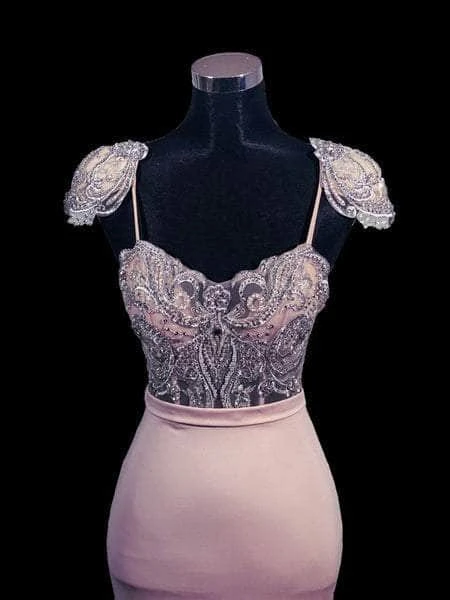 Get ready for everyone to stop and stare when you show up in this Portia and Scarlett PS21191 evening dress. Beautiful embroideries design the fitted bodice, framed with a flattering V neckline and open back. The skirt graces a floor length mermaid silhouette which finishes with a sweep train. You will definitely make a statement in every occasion with this Portia and Scarlett dress. Group picture shows the dress in Stone, Ice and Mauve colors.Â