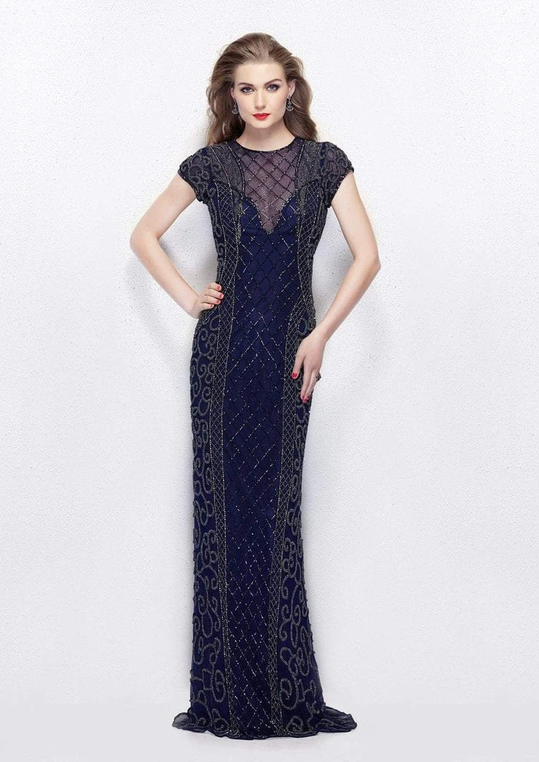 | Details: | Sweetheart bodice, Plunging detail, Illusion details, Cap sleeves, Gold accent, Sheath skirt, Back zip closure |