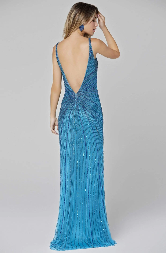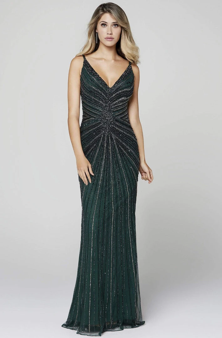 Promote attention-grabbing style in this stunning dress by Primavera Couture 3459. This beaded dress features a sleeveless, plunging V-neckline with thin straps. The fitted bodice flaunts a low V-back and has a zipper closure. The skirt forms a sheath silhouette and finishes in a sweep train. This Primavera Couture dress is perfect for any formal evening.