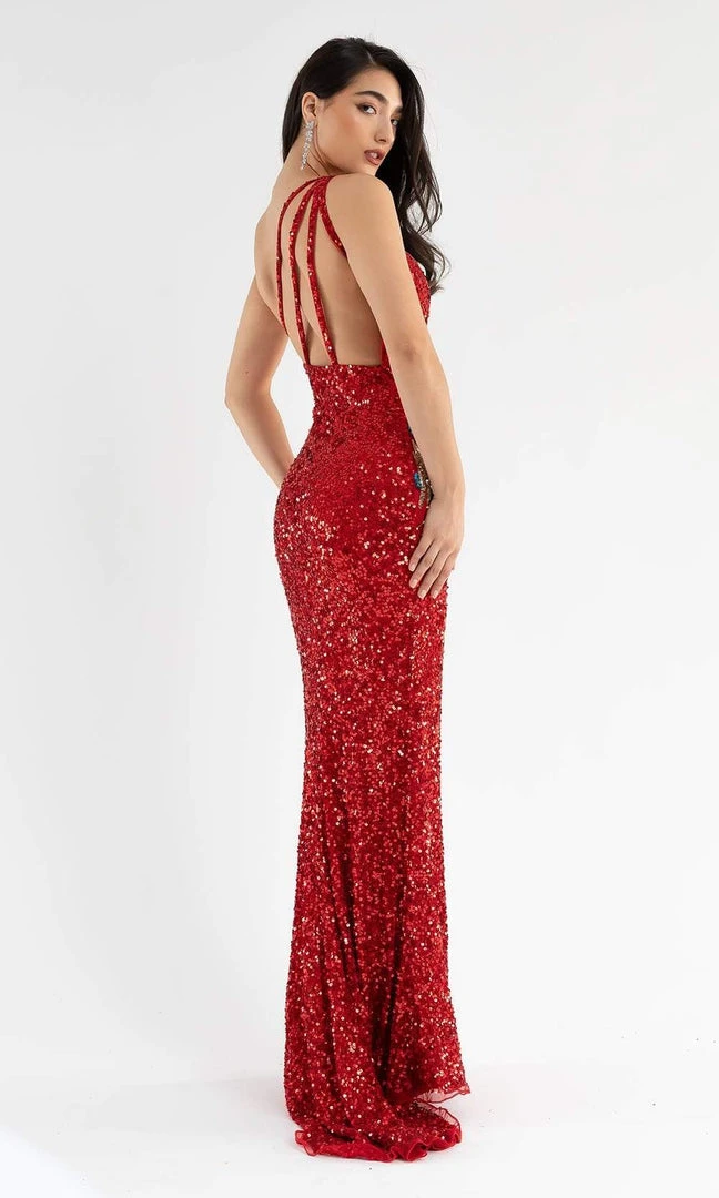 Sparkle in beauty wearing this Primavera Couture 3738. This dress has a peacock-inspired vibe due to the way it incorporates beads and sequins. It features an asymmetric neckline that is held in place by one shoulder strap and leads to an open strappy back. The skirt reveals a high slit as it touches the floor with a train. Shimmer all night long in this sophisticated Primavera Couture masterpiece. Primavera Couture’s sparkling long sequin dresses and cocktail dresses will dazzle you with compliments as these dresses are extremely impressive.