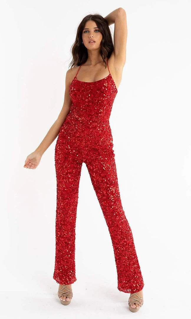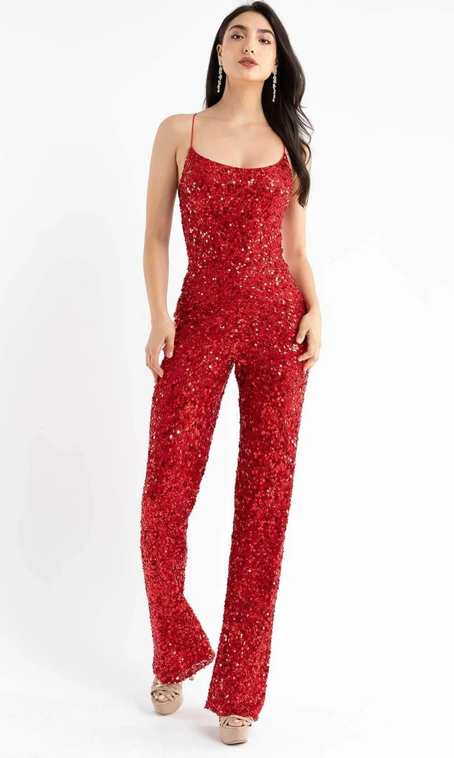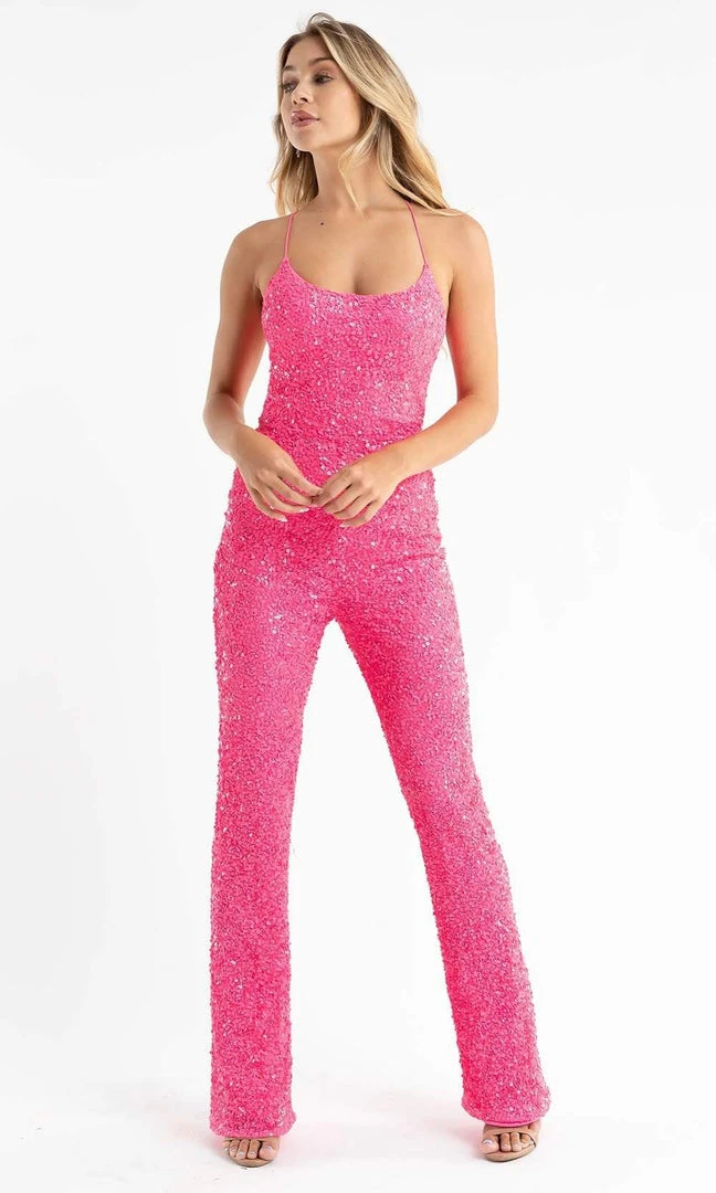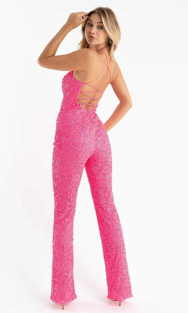 Show off your bubbly and pleasant personality with this sequin jumpsuit by Primavera Couture 3774. This gorgeous pair that has a fashionable sleeveless, scoop neckline and thin spaghetti straps that lace up and tie in the back with fitted bodice would definitely adore everyone in the crowd. This Primavera Couture is tailored to fit your curves. Primavera Couture’s sparkling long sequin dresses and cocktail dresses will dazzle you with compliments as these dresses are extremely impressive.