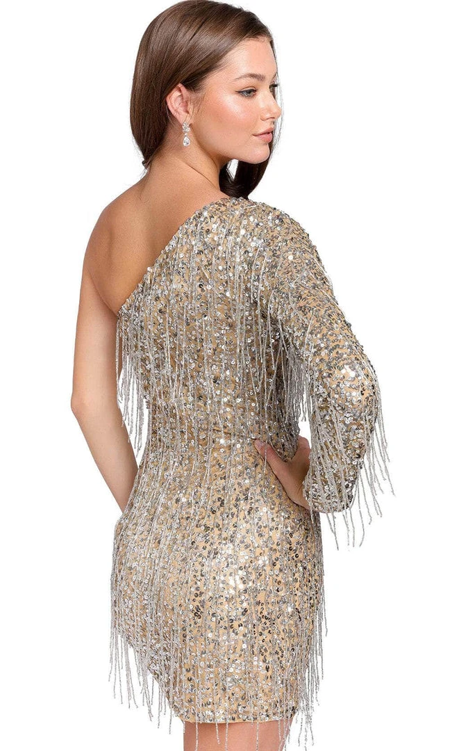 Be ready to fascinate everyone with Primavera Couture 3858 cocktail dress. This ensemble will shine from every angle as the slim-fitting bodice is entirely adorned with sequins and fun beaded fringes. It presents an asymmetrical neckline and mid-open back with slender long sleeves. The skirt is crafted in a sheath silhouette that runs into an alluring short-length hemline. This Primavera Couture design is your excellent pick when you dare to look stylishly spectacular! Models are wearing the Black, Bright Blue, Lilac and Nude Silver colors.