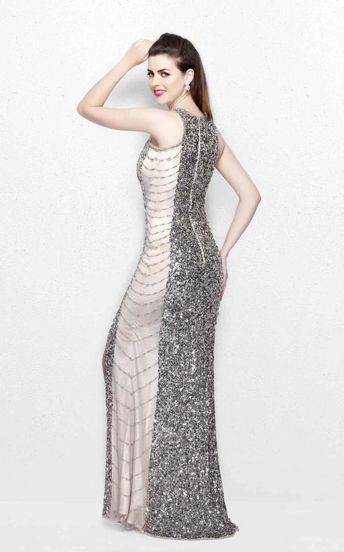 This captivating Primavera Couture 1876 is sure to make you the center of attention. Sleeveless, this dress has a jewel neckline and fitted glittering bodice. Sheer panels flank the gown wit isequined embellishment for added drama. The skirt has a gently draped silhouette with a slit at one side. This gown is full length. Another awesome creation by Primavera Couture.