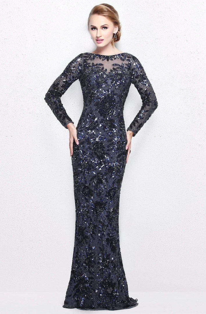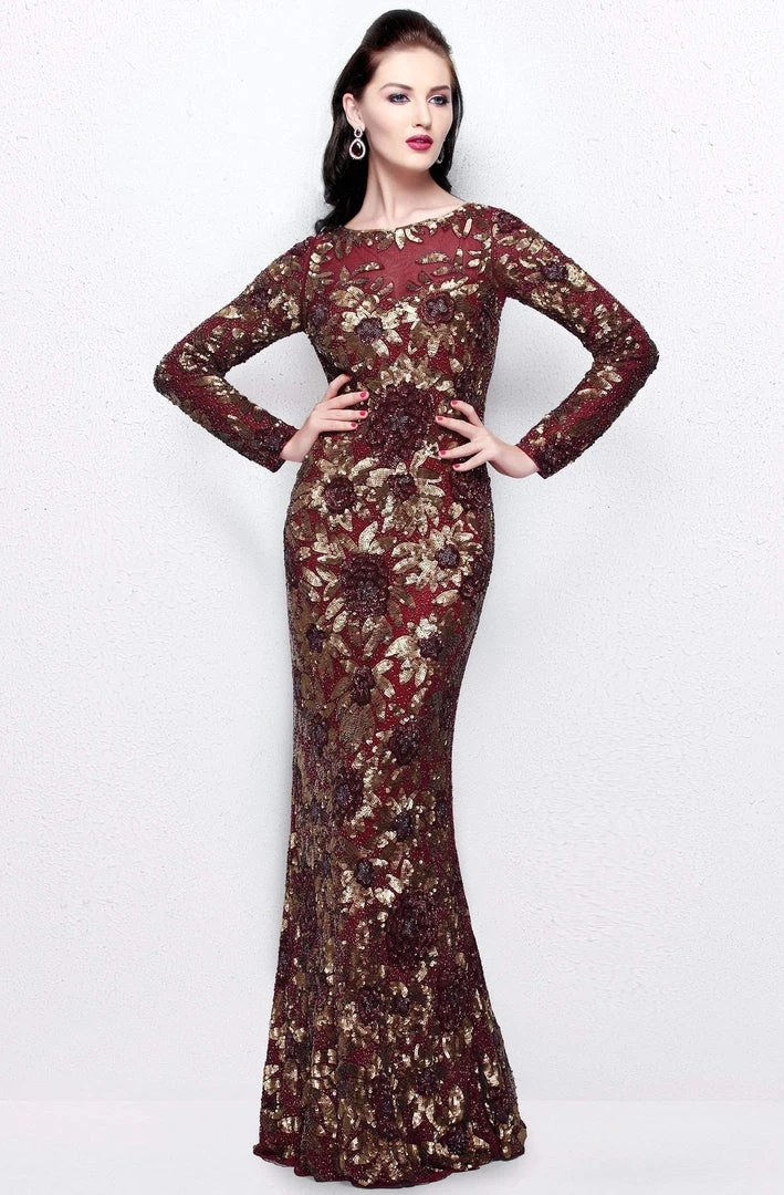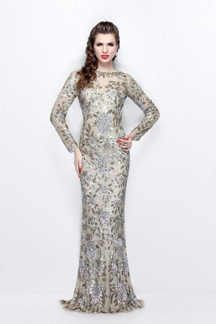 Capture pure elegance in this regal inspired design by Primavera Couture 1401 evening gown! Sparkling metallic sequins floral patterns dominate its design, running along it isheer illusion neckline, long sleeves and down the entire length of its floor-sweeping skirt. The dress slithers smoothly and closely over curves for a dazzling silhouette. Look fierce and command glamour in this shimmering creation by Primavera Couture.