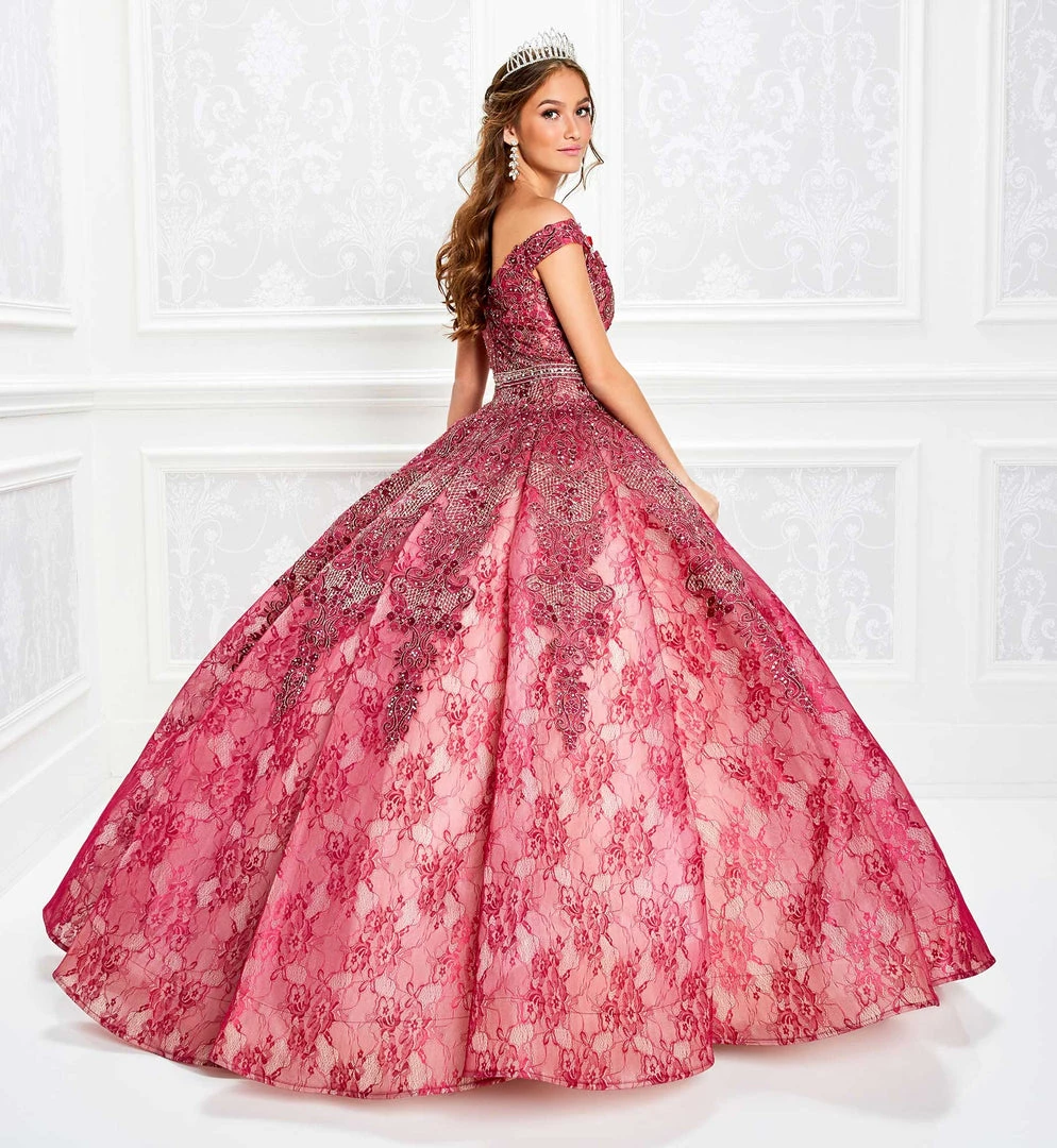 Envision a regal evening with this fabulous Princesa by Ariana Vara PR11921 ballgown. Beautifully crafted in full length lace overlay adorned with lace appliques and beadings, this amazing gown highlights an off-shoulder V-notched neckline with slender arm sleeve, featured with beaded band on the natural waist. The back shows a modest V shape with hidden zipper closure. The skirt flourishes into a majestic ballgown silhouette with horsehair trim for a more defined finish. Make it your moment to stand out wearing this beautiful creation by Princesa by Ariana Vara, perfect for Quinceaneras and sweet sixteen.
