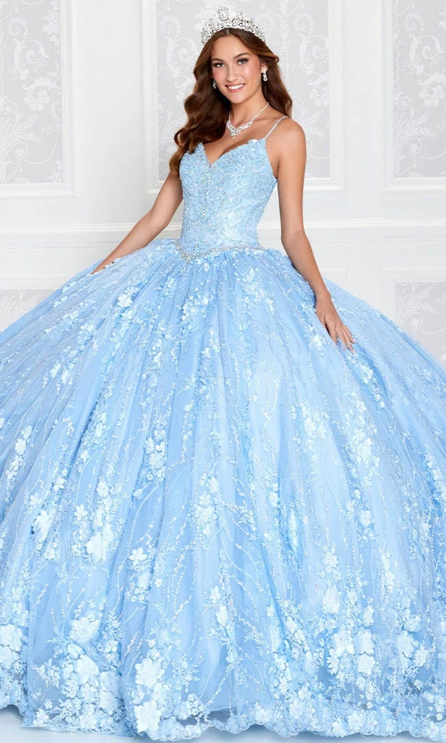 Emerge as a striking vision on your special event in this Princesa by Ariana Vara PR12268 creation. Adorned with a blend of floral lace applique and beadwork, this gown features spaghetti straps trailing into a v-neckline and a corset back. Detailed with a glittering silhouette and embroidered accents, the ballgown skirt cascades down into a grandiose train. Small cape included. Be blown away by the sheer beauty of this Princesa by Ariana Vara masterpiece. Whether your style is modern trendy or timeless classic, Mon Cheri will clothe with poise, elegance and grace for your momentous occasion. Models are wearing the Light Blue and Blush colors.