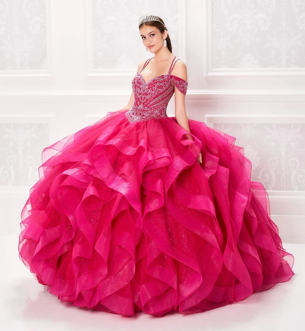 Make them look lavish in this enthralling masterpiece by Princesa by Ariana Vara PR21966. Striking embellishments design the bodice, framed with an off-shoulder neckline with dual thin and draped straps for added support. Ruffle detail highlights the ballgown skirt and finishes with full length and horsehair hemline. Captivate the crowd with this Princesa by Ariana Vara creation.