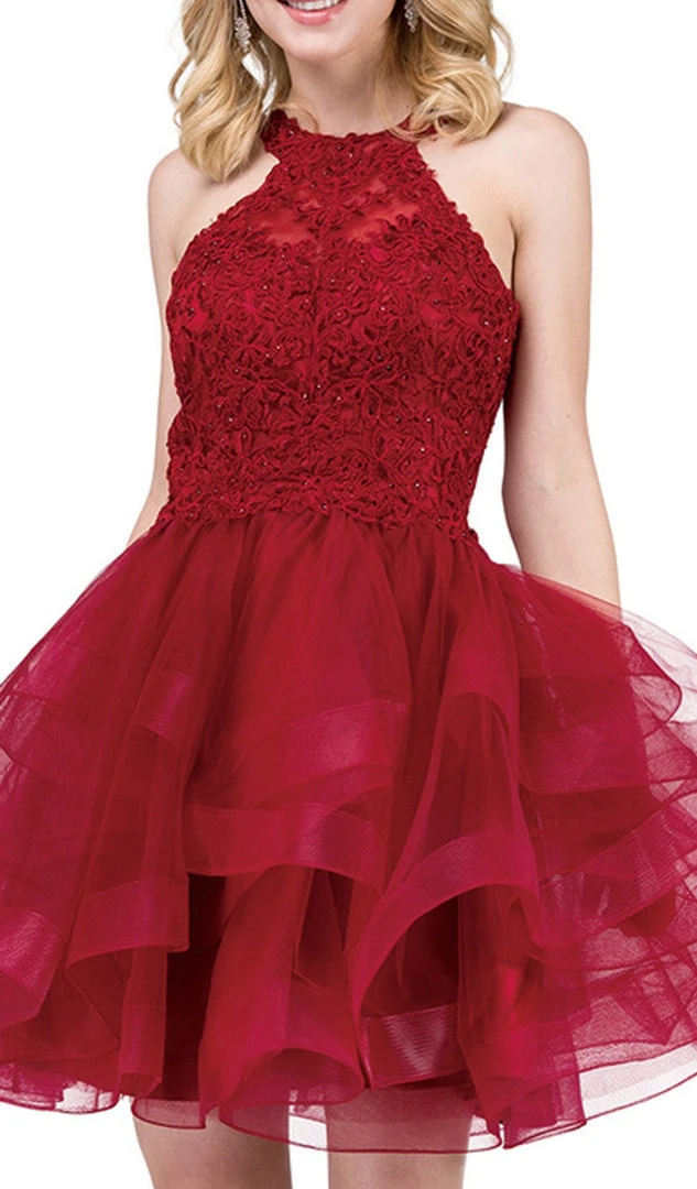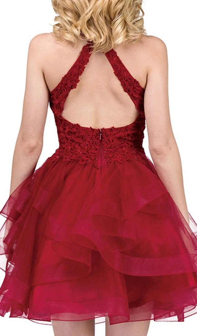 Turn heads instantly when you wear this dazzling Dancing Queen 3078 cocktail dress. This fit and flare ensemble features a Halter style neckline, beaded lace applique bodice and a triangular framed cutout racer back. The bouncy ruffles of soft tulle create playful details on the mini length skirt. The dress finishes with back zipper closure. This Dancing Queen dress is a charming choice for Homecoming, semi-formal party and special occasion.