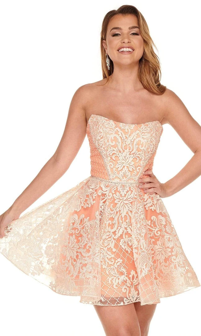 Show off your classy style when you wear this cocktail dress by Rachel Allan 40062. This oh! so pretty and classy fit and flare, glitter patterned tulle dress showcases a strapless bateau neckline with mid-open back, fitted bodice and an A-line silhouette, lined mini-skirt. This design by Rachel Allan is perfect for a standout style and flawless fit for an remarkable Homecoming.