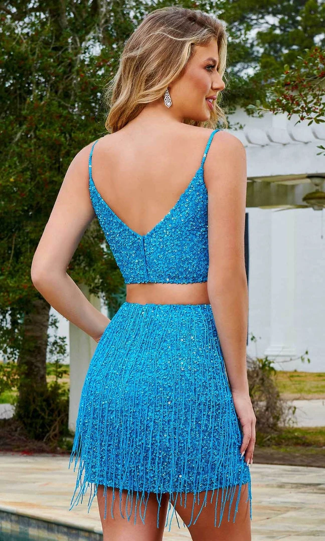 Capture everyone’s attention as you don an iridescently tailored Rachel Allan 40199 creation. Beautifully crusted with beadwork and iridescent sequins allover its fitted length, this dress features a cropped top with a sweetheart neckline and thin shoulder straps. A scoop back with a zipper closure complements this ensemble. Embellished with beaded fringes, the sheath skirt sculpts and ends with a mini hemline. Look awesome from all angles in this two piece Rachel Allan masterpiece. Models are wearing the Fuchsia, Ocean Blue, Pink Coral, Tangerine and Yellow colors.