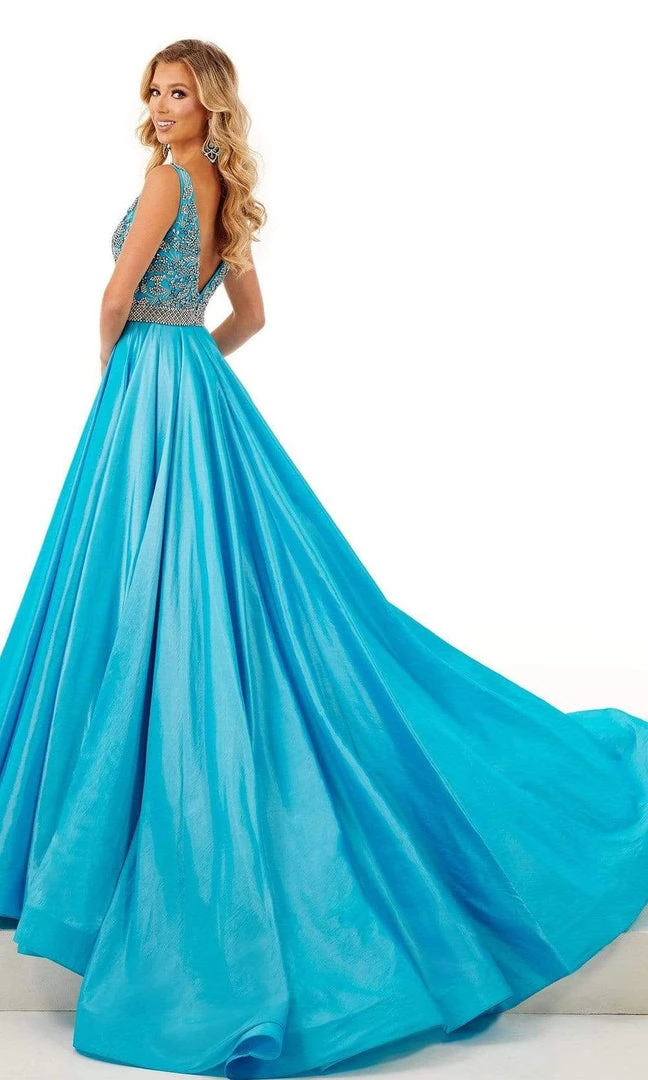 Grace that spectacular party like a much celebrated celebrity in this Rachel Allan 50104 creation. Embellished with multi-colored beadwork on a sleeveless bodice, this opulent stunner parades a plunging v-neckline with a sheer inset. Defined with a v-open styled back that rhymes with the bodice. A glimmering ban wraps the waist. Draped with a high slit, the A-line skirt cascades into a grandiose train. Impress everyone with the regal style of this Rachel Allan masterpiece.