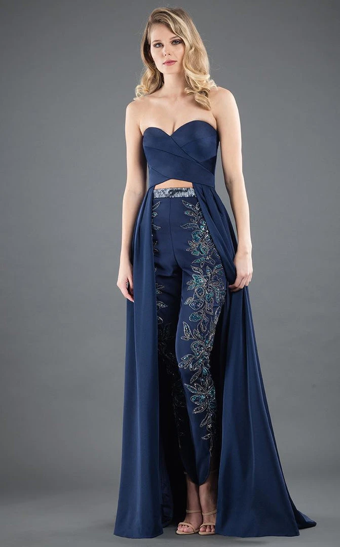 You are sure to turn heads wearing this formal jumpsuit from Rachel Allan 8289. The top has a strapless sweetheart neckline with a front cutout at the bodice. Smooth fabric lengthens at back creating a draped effect. The complimenting pants have a high waist and dazzling embellishment. Look fashionably chic and fabulous in this Rachel Allan dress.