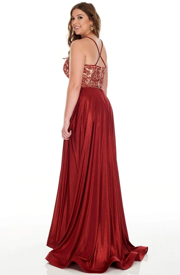 Relish the impeccable elegance of this Rachel Allan 7235 Curves creation. Exquisitely ornamented with faceted rhinestones in an elaborate pattern, this two-piece ensemble flourishes a deep v-neckline with spaghetti straps. The nude lined crop top reveals a mid-open back with crisscrossing straps. Bejeweled along the natural waist, the metallic shimmer jersey skirt parts with a high slit as it touches the floor with a train. Steal the show like a total stunner in this Rachel Allan masterpiece.
