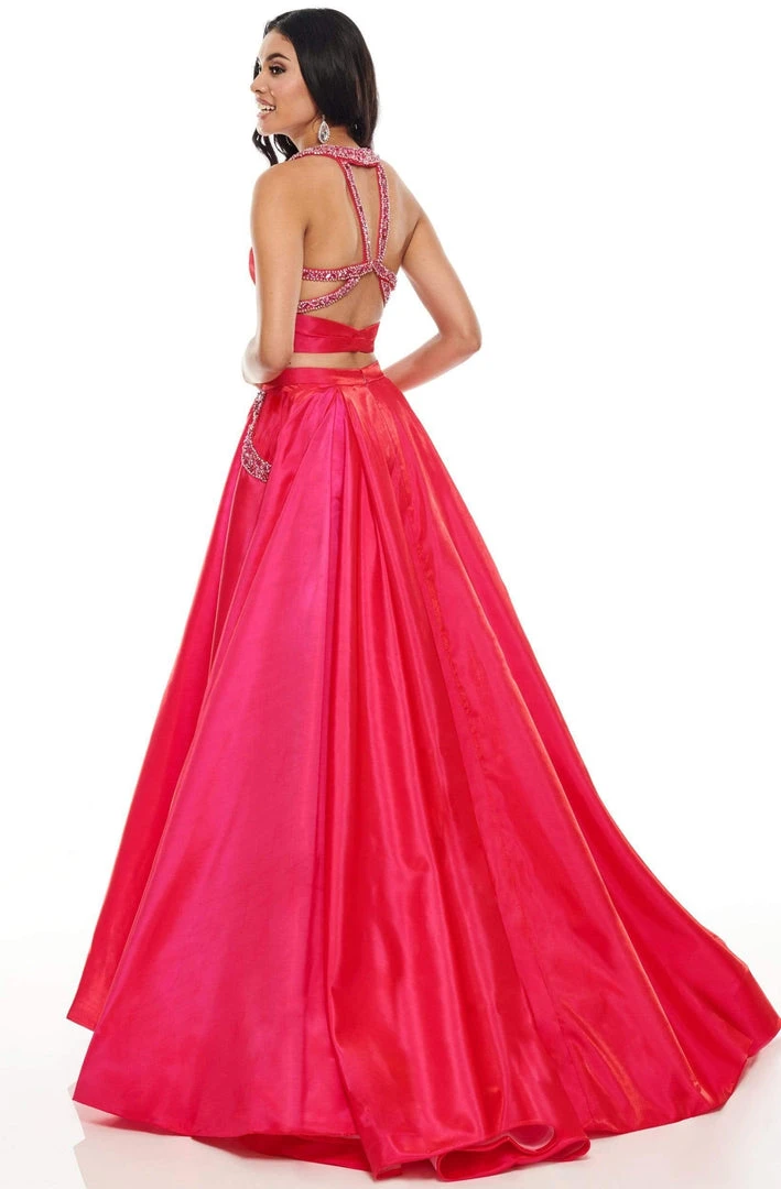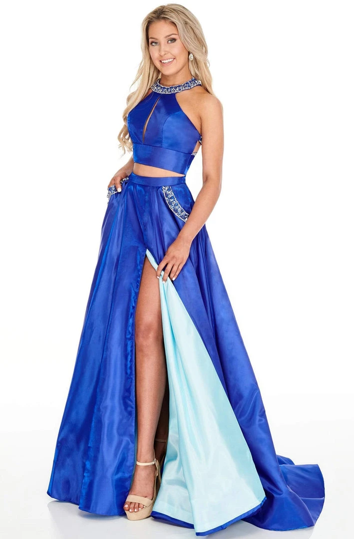 Make a fashion forward statement at your upcoming social event with this Rachel Allan Prom 7009 masterpiece. This two piece dress features a beaded crop top embellished with tone on tone beading, framed with a high halter neckline with a peep hole cutout detail. The a-line skirt reveals a high slit for a fun and flirty effect and convenient side pockets. The back of this dress displays a strappy criss cross closure and a dramatic sweep train. You are certain to turn heads with this glamorous Rachel Allan Prom ensemble.