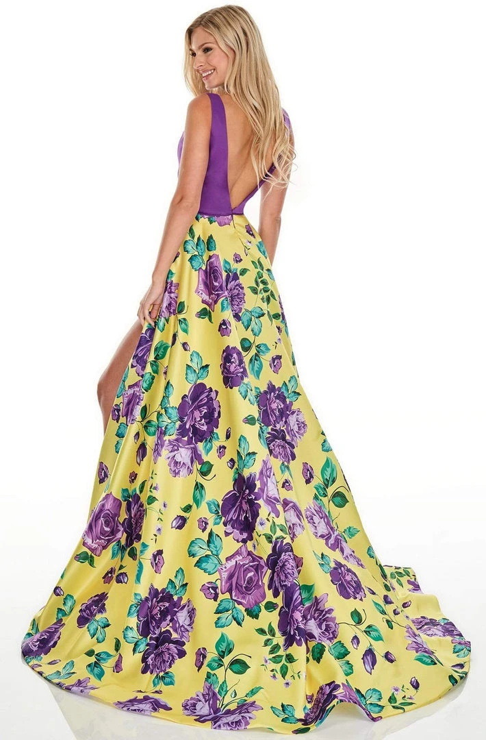 Create your own fairy tale in this unforgettably crafted Rachel Allan Prom 7021 creation. Trimmed with tracing lines on a sleeveless bodice, this gown charms with a plunging v-neckline and a tonal illusion inset. Overlaid with mesh along the plunged sides, the back is rendered with a deep v-open back. The floral printed skirt opens with a high slit as it flares into a romantic silhouette with a train. Take everyone’s breath away in this Rachel Allan masterpiece. Models are wearing the White Royal and Yellow Purple colors.